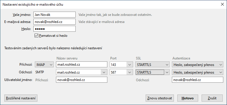 - Vyplňte nastavení podle příkladu, klikněte na Znovu otestovat, případně upravte nastavení a klikněte na Hotovo