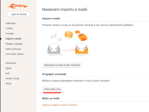 Nastavení - Import e-mailů - Propojení schránek a klikněte na Přidat další účet: